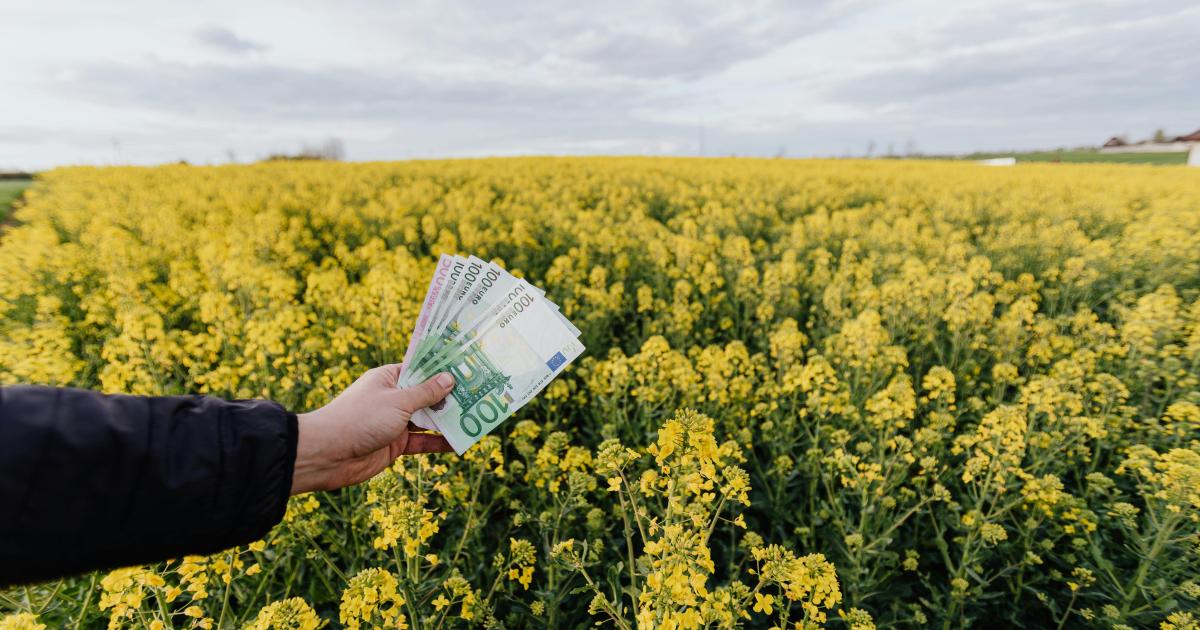 Bild på ett rapsfält och en människa som håller pengar.